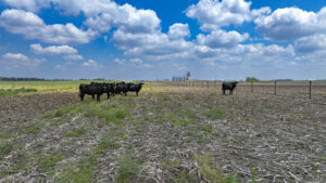 Figure 14: Champaign County, May 7, 2025 – Cattle recently turned out to graze cover crop at the Farm of the Future site on the UIUC campus (photo credit: Jim Baltz – farmdoc web team).